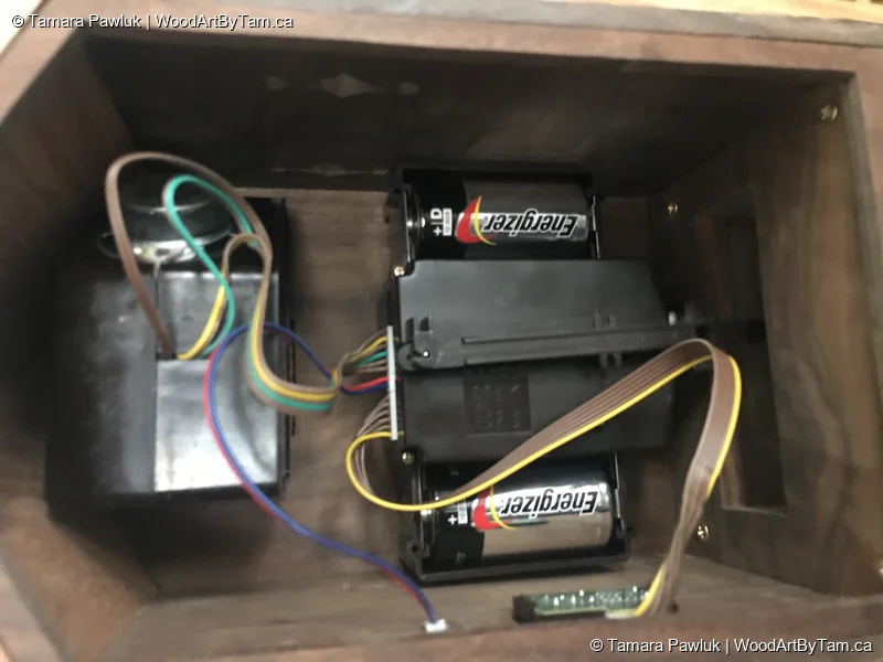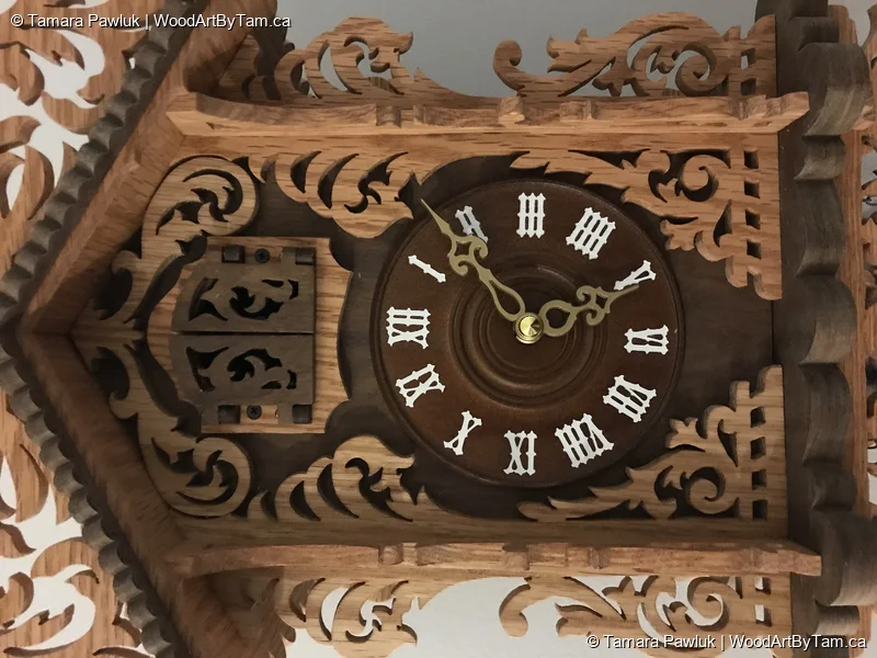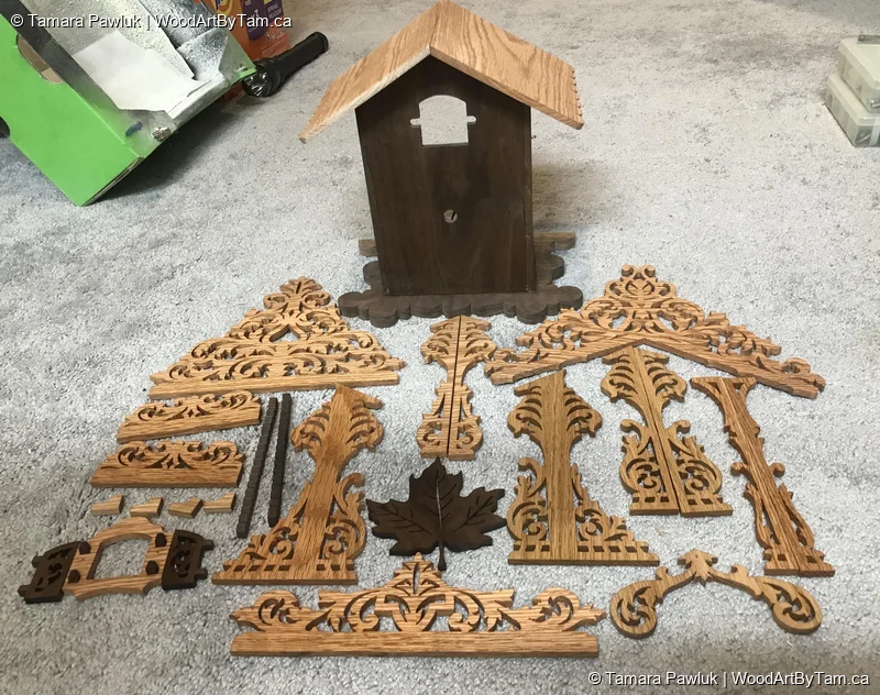 Turns out I could. This is my most ambitious pieces to date. It was amazingly challenging. Especially making it all square and fit together properly and the little doors that had to open almost broke me. But it all worked out and the little bird pops out and cuckoos every hour too! I certainly couldn’t use my usual baltic birch plywood for this amazing clock so I had to find a supplier that sold hardwood. I found a place online (in the States) and it cost me a pretty penny to order enough 1/4″ walnut and red oak. The place I got the pattern from also had a kit that came with all the required hardware. This hangs at my mom’s place and I am exceedingly proud of it.