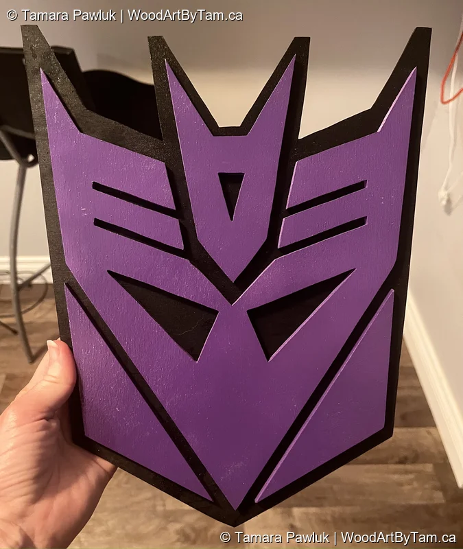 Made this on request from my Transformers loving daughter to hang in her room. Made from A 1/4″ backing piece painted black and a 1/8″ top pieces painted purple.