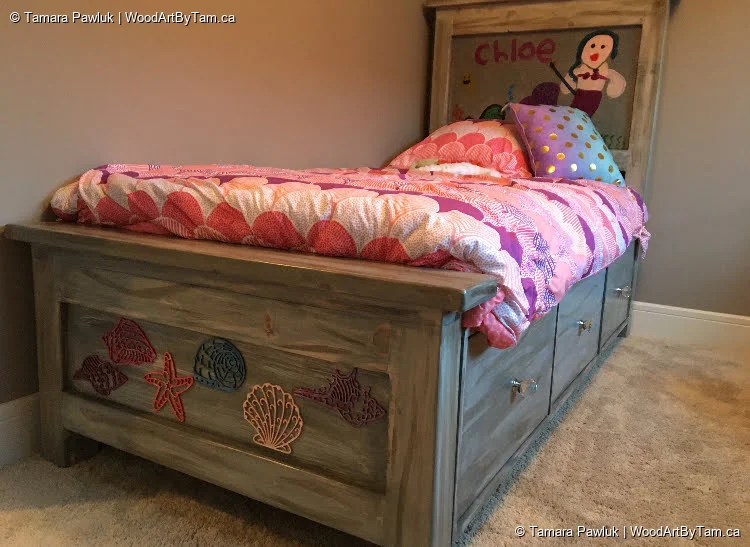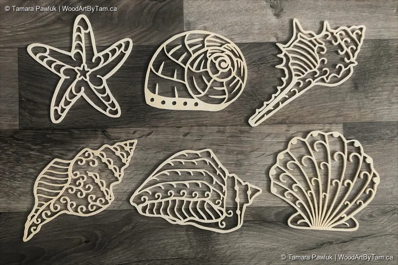 Made as an order from someone who was building a bed for his daughter and wanted these shells as decorations to add to it. These are very delicate and cut from 1/8″ baltic birch. He wanted them unfinished as he painted them himself. He was nice enough to send me a picture of them on the finished bed.