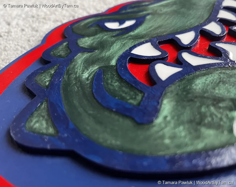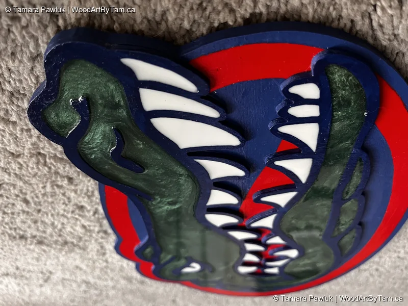 Made as a present for my brother-in-law. Cut from baltic birch plywood. The bottom layer is 1/4″ and the top layer is 1/8″. Painted blue and orange and then I poured resin mixed with green mica powder for the gator and white dyed resin for his teeth and eye.