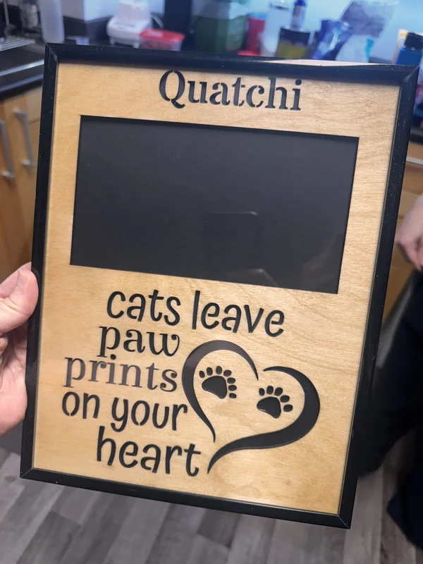 I made this one first as a commission piece for a customer who had lost her fur baby. Then I got an order for another. I found the saying online, cut it from 1/4″ baltic birch and cut out a rectangle for the person to add a picture of their beloved fuzz friend. When my mom’s cat T.J. died, I remembered this piece and made one for her as well. But I added the pictures myself and coated the whole piece in a thin layer of clear resin which gave it a lovely finish.