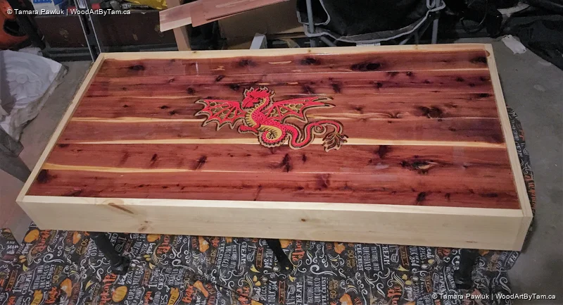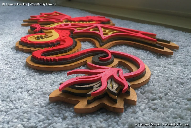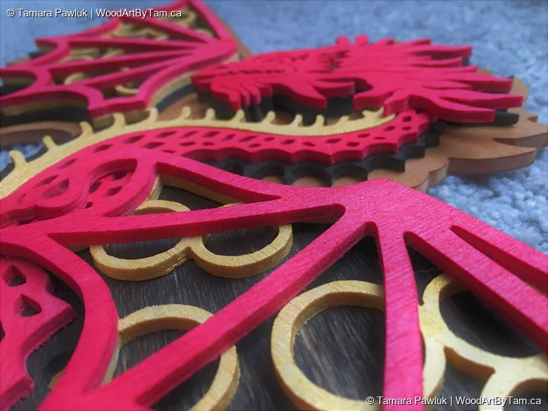 I made this one just because I loved it and enjoyed the multilayered challenge. I cut each of the 4 layers from 1/4″ baltic birch and finished them with red and gold paint and stains. I love the final assembled piece! I actually can’t remember what happened to the first one I made but I got an order for another through my Etsy shop and the guy who bought it embedded it in resin into a table he made that will be used for D&D gaming. How cool is that!? He sent me a picture that you can see below.