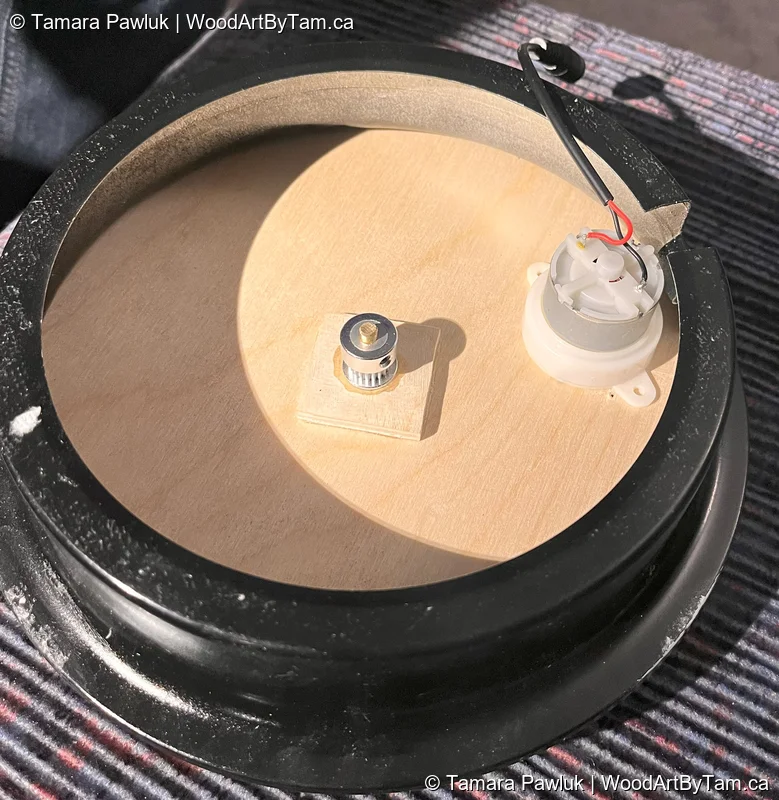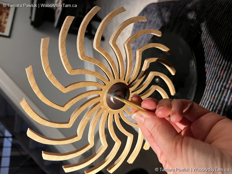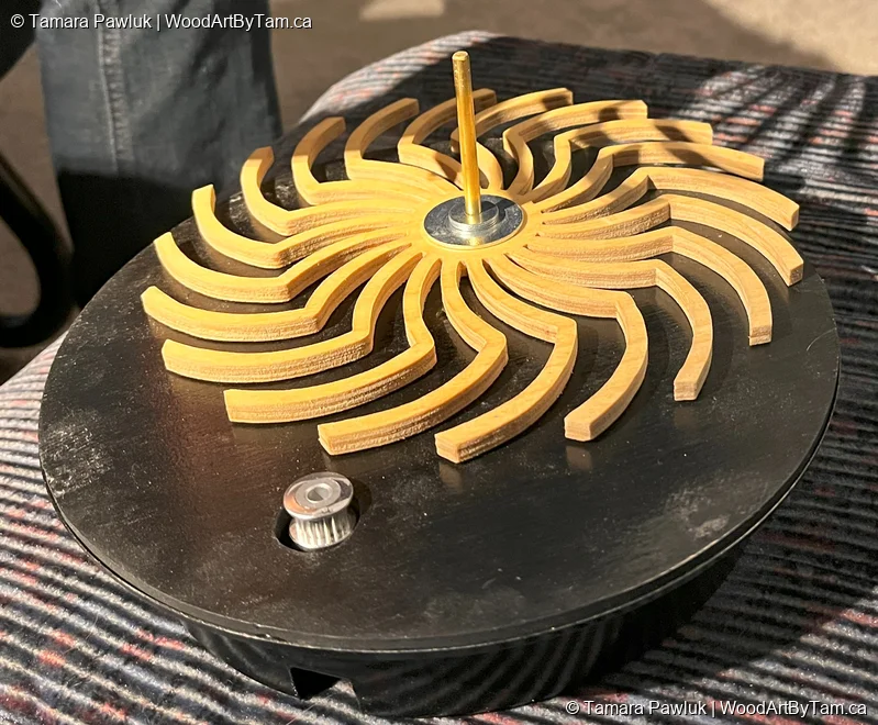 When I came across this pattern, I knew I had to try it for a challenge. The pattern called for just wooden gears and rubber bands. Peter insisted that just would not do and convinced me to buy metal cogs and posts and proper rubber belts along with the small motor from Amazon. I cut out the wooden pieces from 1/4″ baltic birch and Peter helped me with some of the technical assembly. I used an old clock casing to mount it on which worked perfectly to hide the components in the back. So we ended up altering the original plans significantly. I’m happy with the way it turned out and it looks pretty trippy when running.