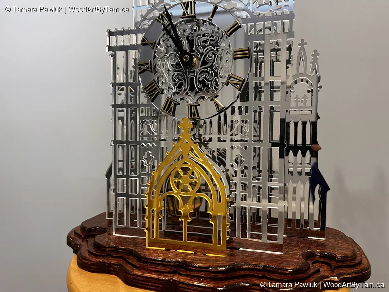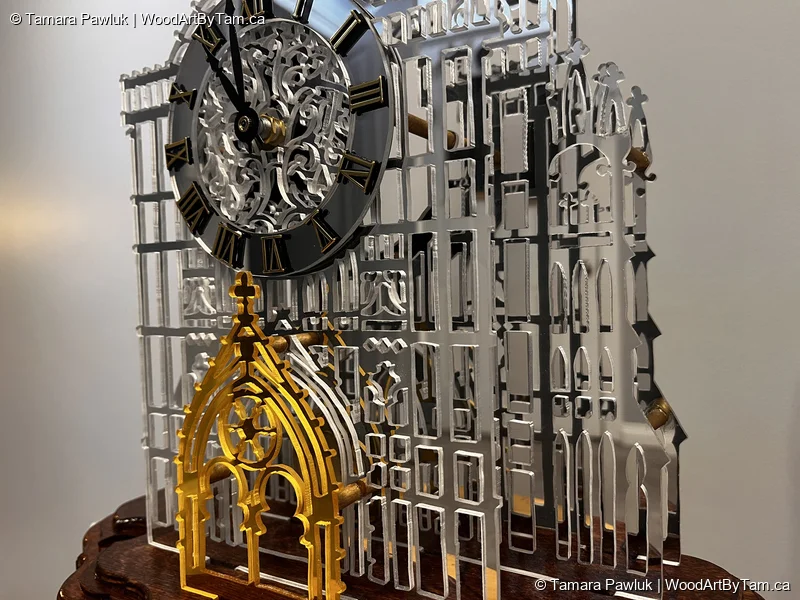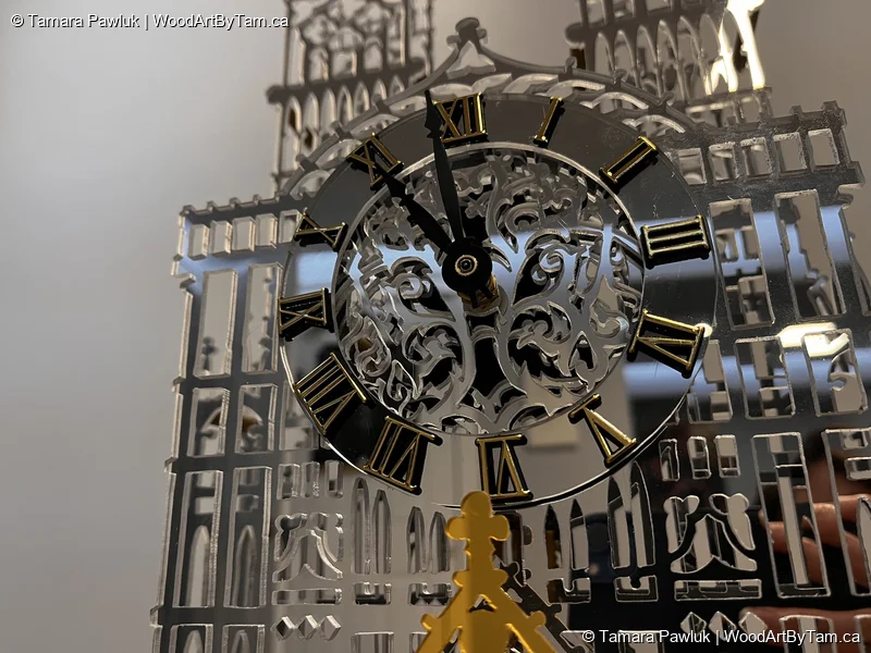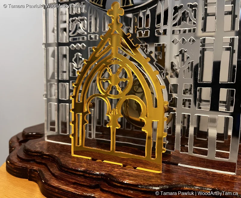 When I saw the pattern for this, I just had to try it. It was on my radar for years until I finally pulled the trigger and bought the pattern. It was not a very good pattern and the instructions were lacking and material lists were non existant. I bought some mirrored plexiglass online and hoped for the best. After a lot of cutting, I had to figure out how what to use in place of the little brass spacers. A lot of research later, I decided to just use a dowel that I cut and painted gold and glued in between the pieces. I found a clock parts supplier online and luckily ordered the proper parts that fit perfectly. I cut the base from various thickness plywood. I also used my lovely new hand router to round over the edges. It’s not perfect but it’s not bad and I enjoyed the challenge.