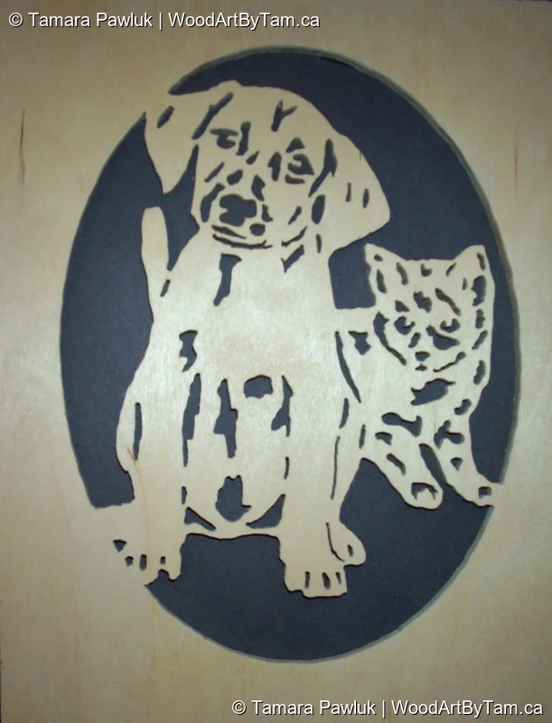 This is the first ever piece I made with my scroll saw many, many years ago. I expressed an interest in scrolling after seeing a magazine and told my dad. He very generously bought me my first scroll saw (Dremel brand) and I was instantly hooked. The rest is history! This piece is cut from 1/4″ baltic birch and framed. It hangs in my mom’s house as a reminder of how far I’ve come with this art form.