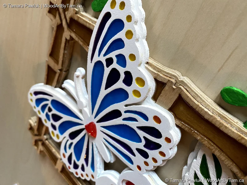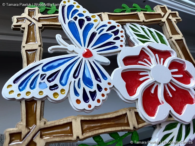 Cut from 5 layers of 1/8″ baltic birch and painted and finished with resin. Plus a little handmade resin heart for just a tiny embellishment.