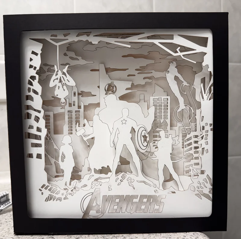 There is a shop out there that has so many patterns for shadow boxes for every franchise you can think of and they have so many I would love to make. They take quite a bit of effort. You have to cut all the layers then assemble them with foam core borders in betwwen the layers to separate them. I made a cardstock frame which is a bit flimsy but I think it would look great in an actual shadow box frame. Then there’s the whole lighting business which I really haven’t figured out yet. But these are cool and I like them a lot.