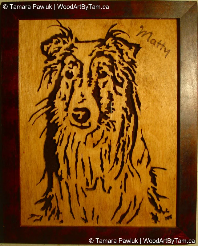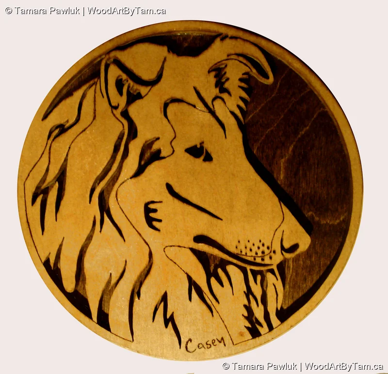 Made on request for a friend who wanted his doggos in wood art form. I got a pattern made from the photo of one of them and I found a pattern of a sheltie for the other. Cut from 1/4″ baltic birch and stained. I also added their names with a wood burner for a touch of personalization. My friend kindly sent me a picture of the puppers posing with their art.