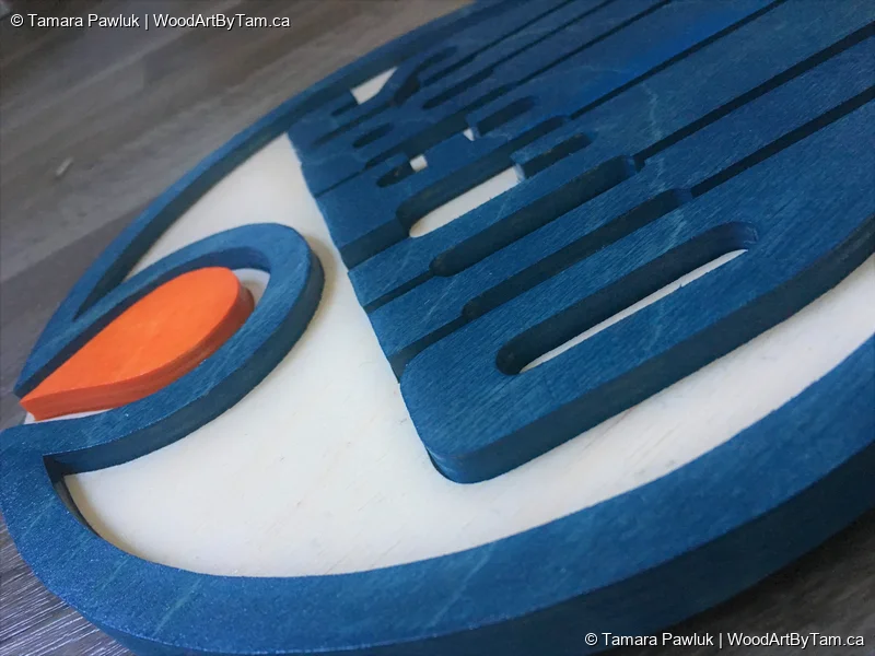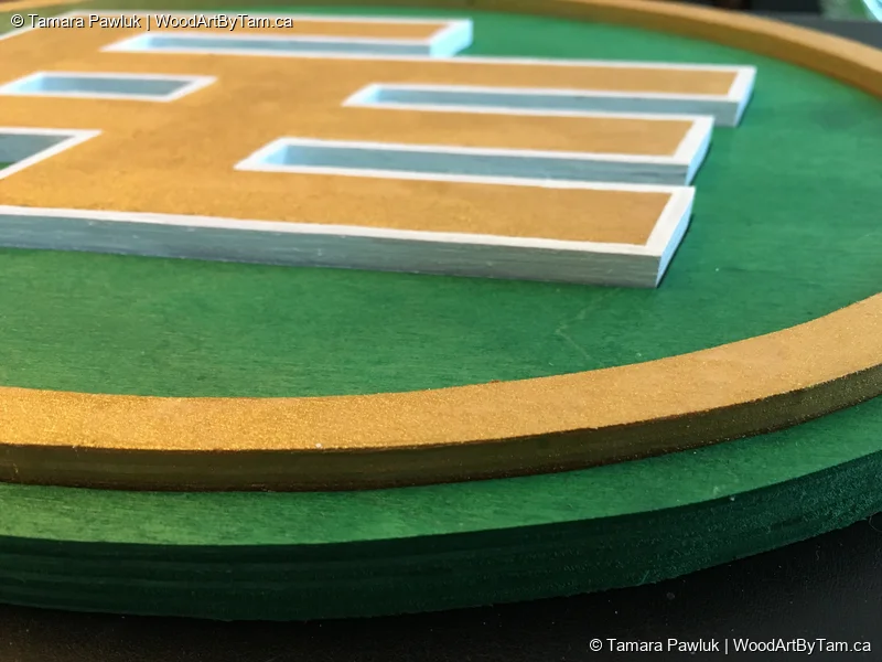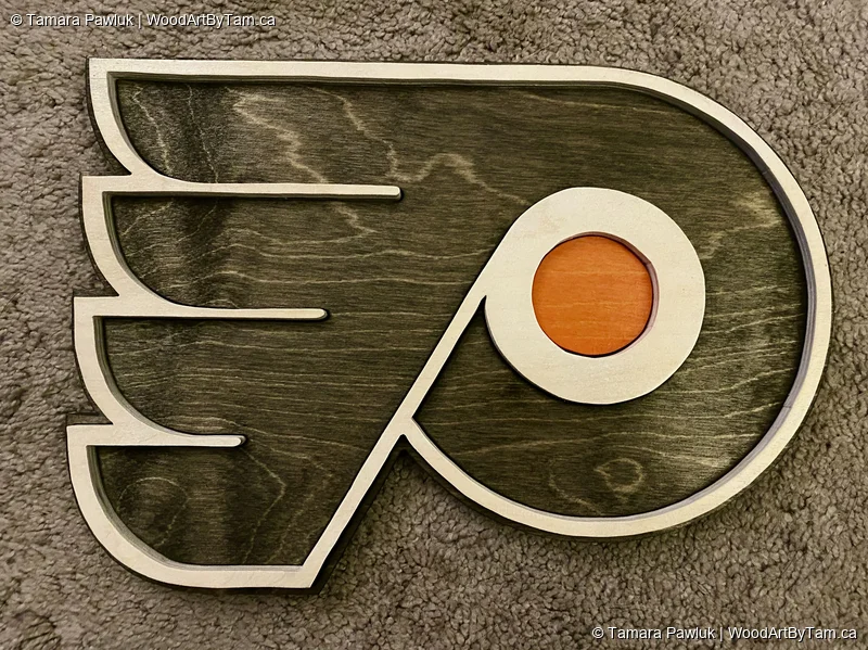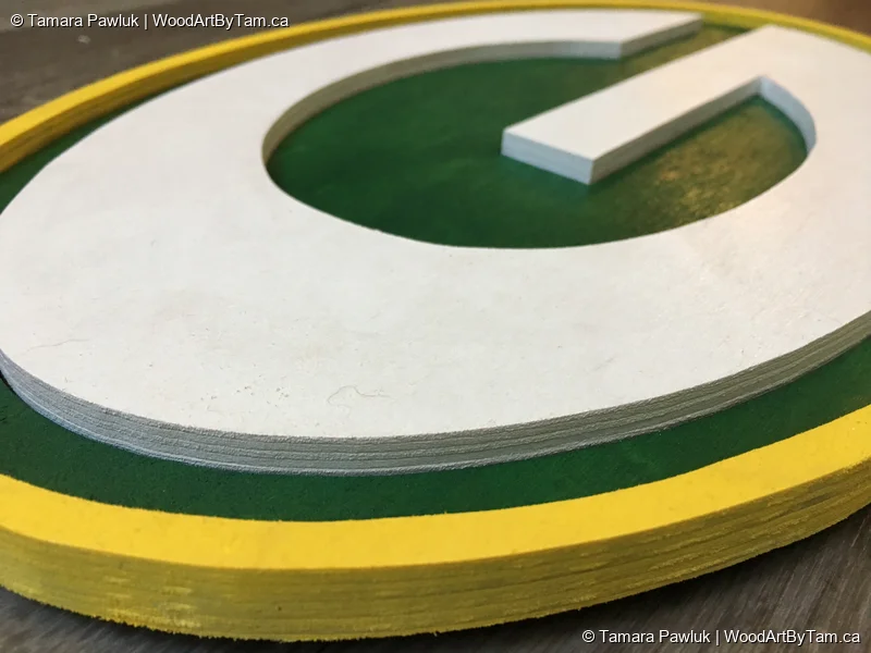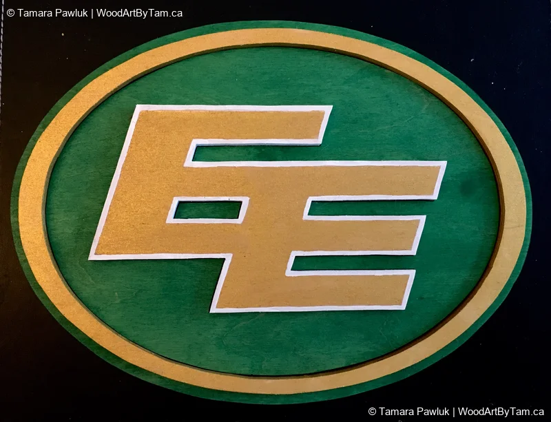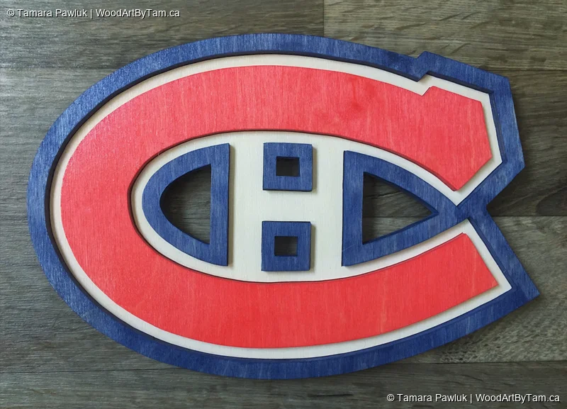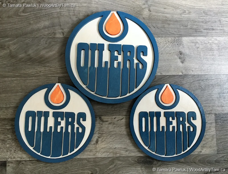 I made the Oilers logo first as I live in Edmonton and I figured it would be a good seller at the Farmer’s Market. Once people saw that one though, they asked me to make logos from their team of choice as well. These are cut from 1/2″ baltic birch (the smaller Oilers one is 1/4″) and painted accordingly then reassembled in differing depths to make the whole thing more interesting. This is a form of woodworking called segmentation.