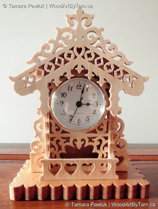 Cut from 1/8″ and 1/4″ baltic birch and mounted on a piece of hardwood. With an extra large clock face mounted inside. Made as a present for my mom.