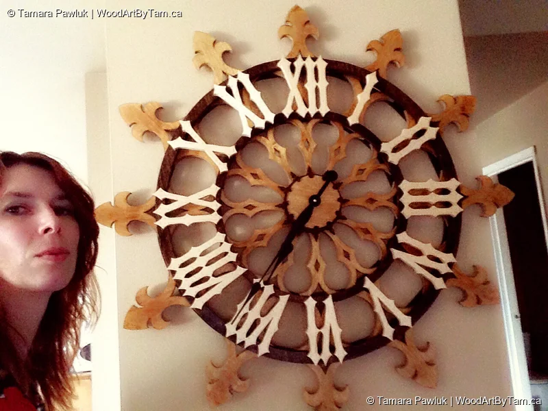 Made just because the challenge intrigued me. This is a massive clock and a big project. But it turned out great and even keeps time! Cut from 1/2″ baltic birch.